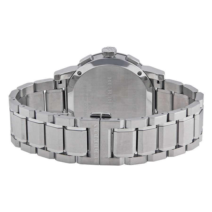 Stainless steel case with a stainless steel bracelet. Fixed stainless steel bezel. Blue dial with silver-tone hands and index hour markers. Minute markers around the outer rim. Dial Type: Analog. Date display at the 4 o'clock position. Chronograph - three sub-dials displaying: 60 second, 30 minute and 12 hour. Quartz movement. Scratch resistant sapphire crystal. Pull / push crown. Solid case back. Case diameter: 42 mm. Case thickness: 11 mm. Round case shape. Band width: 21 mm. Deployment clasp with push button. Water resistant at 50 meters / 165 feet. Functions: date, hour, minute, second. Casual watch style. Burberry Chronograph Blue Dial Stainless Steel Men's Watch BU9363.