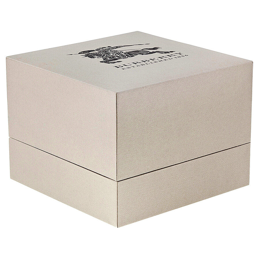 Stainless steel case with a stainless steel bracelet. Fixed stainless steel bezel. Silver check stamped dial with silver-ton hands and index hour markers. Minute markers around the outer rim. Dial Type: Analog. Date display at the 3 o'clock position. Swiss quartz movement. Scratch resistant sapphire crystal. Solid case back. Case diameter: 38 mm. Case thickness: 8 mm. Round case shape. Band width: 30 mm. Deployment clasp. Water resistant at 50 meters / 165 feet. Functions: date, hour, minute, second. Dress watch style. Watch label: Swiss Made. Burberry Silver Dial Stainless Steel Unisex Watch BU9000.