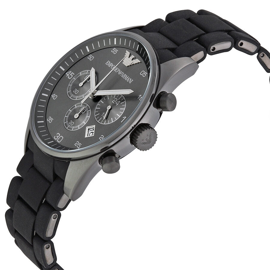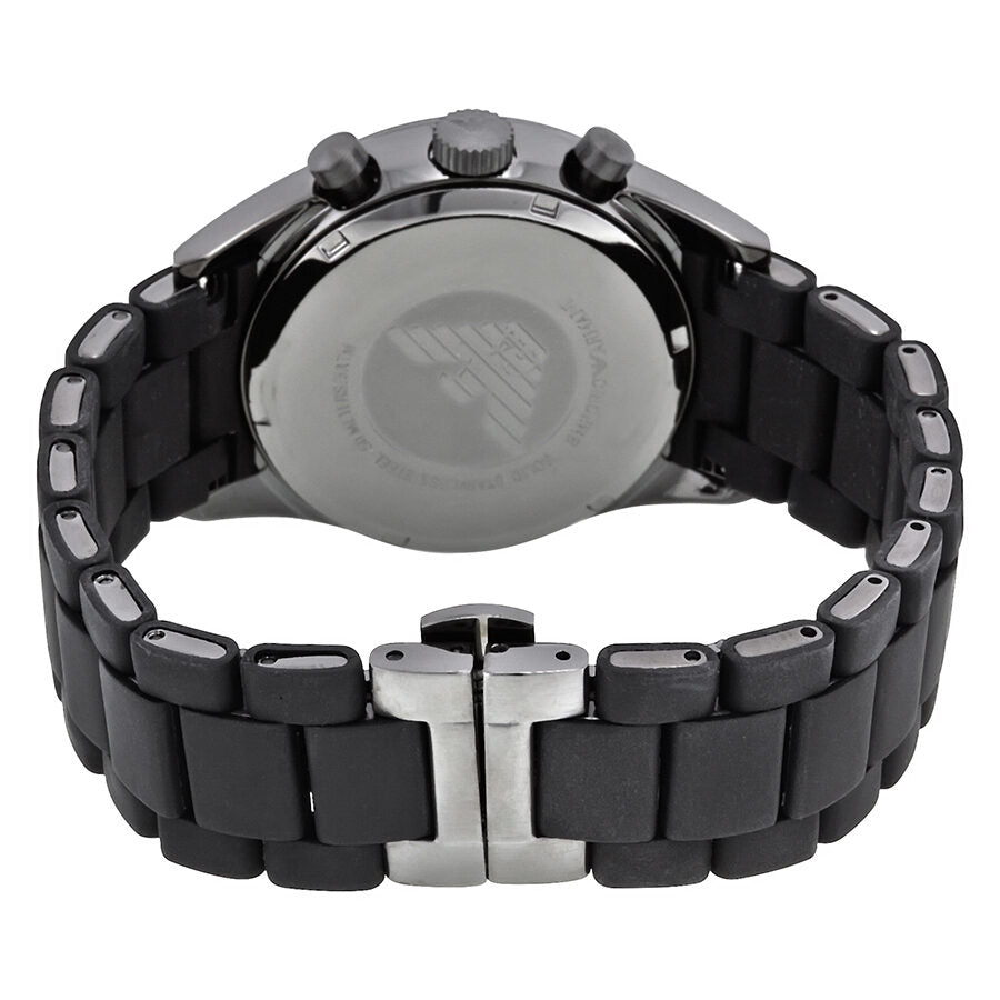 Stainless steel case with a black polyurethane-wrapped stainless steel bracelet. Fixed stainless steel bezel. Black dial with luminous black hands and index hour markers. Arabic numeral minute markers (at 5 minute intervals). Minute markers around the outer rim. The Emporio Armani logo appears at the 12 o'clock position. Dial Type: Analog. Luminescent hands and markers. Date display between 4 and 5 o'clock positions. Chronograph - three sub-dials displaying: 60 second, 60 minute and 24 hour. Quartz movement. Scratch resistant mineral crystal. Screw down crown. Solid case back. Case diameter: 43 mm. Case thickness: 12 mm. Round case shape. Band width: 21 mm. Deployment clasp. Water resistant at 50 meters / 165 feet. Functions: chronograph, date, hour, minute, second. Casual watch style. Emporio Armani Sport Chronograph Black Dial Men's Watch AR5889.