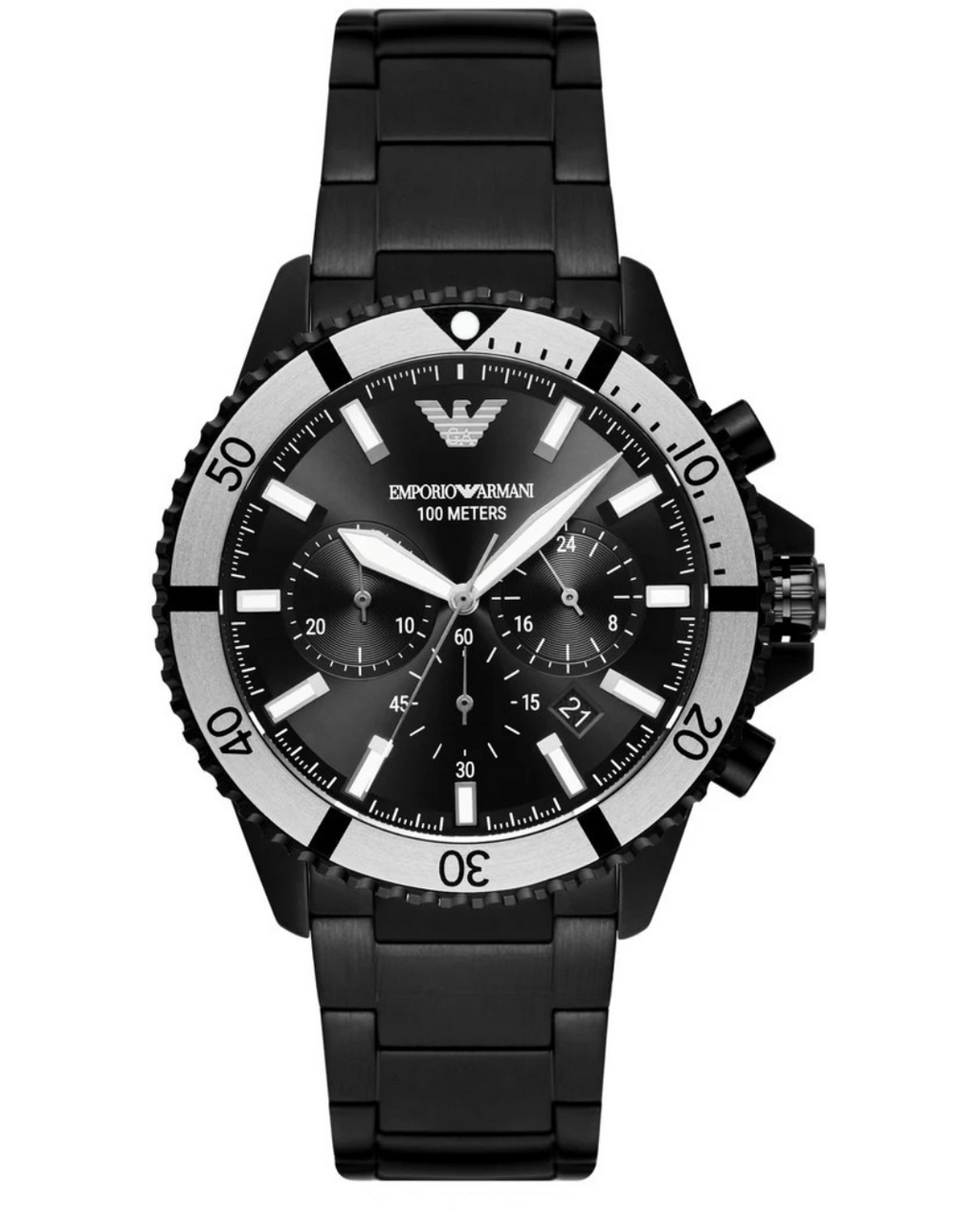 An Emporio Armani AR80050 Diver watch for men, with a 43mm round black stainless steel case, a black dial.