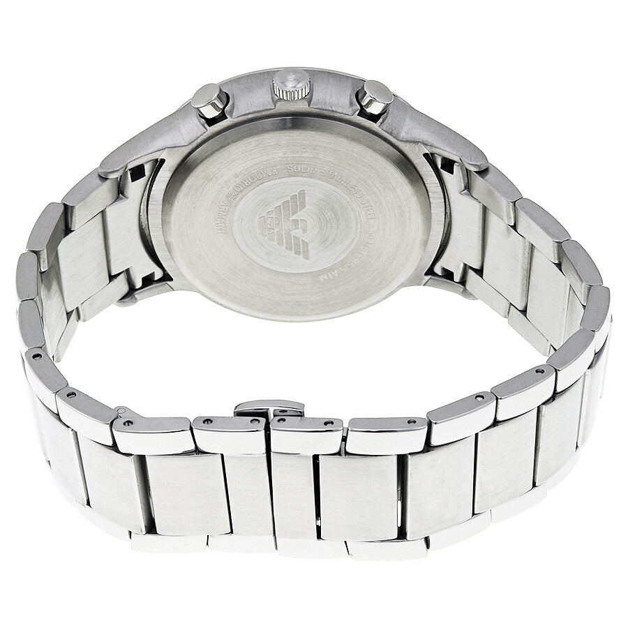 Stainless steel case with a stainless steel bracelet. Fixed stainless steel bezel. Navy blue dial with silver-tone alpha-style shape hands and index hour markers. The Emporio Armani logo appears at the 12 o'clock position. Minute markers around the outer rim. Dial Type: Analog. Date display between the 4 and 5 o'clock positions. Chronograph - three sub-dials displaying: 60 second, 60 minute and 24 hour. Quartz movement. Scratch resistant mineral crystal. Pull / push crown. Solid case back. Round case shape. Case size: 43 mm. Case thickness: 12 mm. Band width: 22 mm. Fold over clasp with a push button release. Water resistant at 50 meters / 165 feet. Functions: chronograph, date, hour, minute, second. Casual watch style. Emporio Armani Chronograph Navy Blue Dial Men's Watch AR2448.