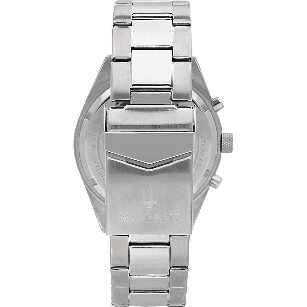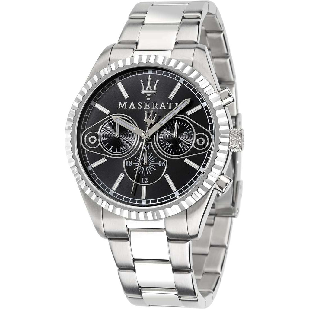 Stainless steel case with a stainless steel bracelet. Fixed stainless steel bezel. Black dial with luminous silver-tone hands and index hour markers. Minute markers around the outer rim. Dial Type: Analog. Luminescent hands and markers. Three multi-function sub-dials displaying: 24 hours, date and day of the week. Quartz movement. Scratch resistant mineral crystal. Screw down crown. Solid case back. Round case shape. Case size: 43 mm. Case thickness: 11.5 mm. Band width: 22 mm. Fold over clasp with a push button release. Water resistant at 100 meters / 330 feet. Functions: chronograph, hour, minute, second, day, date. Competizione Series. Casual watch style. Maserati Competizione Chronograph Quartz Black Dial Men's Watch R8853100014.