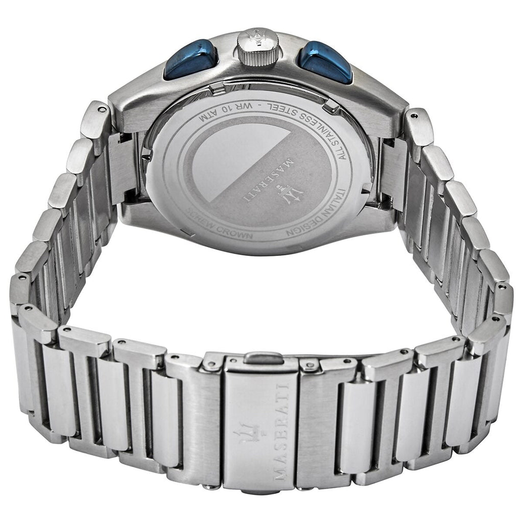 Silver-tone stainless steel case with a silver-tone stainless steel bracelet. Fixed silver-tone stainless steel bezel. Blue dial with luminous silver-tone arrow-shaped hands and index hour markers. Minute markers around the outer rim. Dial Type: Analog. Luminescent hands and markers. Date display at the 6 o'clock position. Chronograph - three sub-dials displaying: 60 second, 30 minute and 24 hours. Miyota Caliber JS25 quartz movement. Scratch resistant mineral crystal. Pull / push crown. Solid case back. Round case shape, case size: 43 mm, case thickness: 13 mm. Band width: 24 mm. Fold over with push button release clasp. Water resistant at 100 meters / 330 feet. Functions: chronograph, date, hour, minute, second. Casual watch style. Watch label: Japan Movt. Maserati Triconic Chronograph Quartz Blue Dial Men's Watch R8873639001.