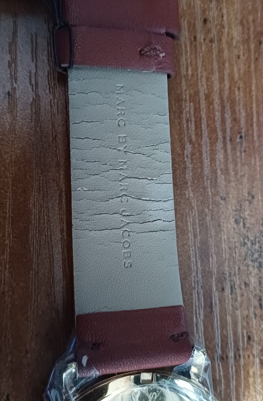 Please note: This watch has some tear marks on the strap. Gold ion-plated stainless steel case with a brown leather strap. Fixed gold ion-plated bezel. Green dial with gold-tone hands and index hour markers. Arabic numerals mark the 6 and 12 o'clock positions. Minute markers around the outer rim. Dial Type: Analog. Luminescent hands and markers. Day of the week and date display at the 3 o'clock position. Quartz movement. Scratch resistant mineral crystal. Pull / push crown. Solid case back. Case diameter: 42 mm. Case thickness: 12 mm. Round case shape. Band width: 22 mm. Tang clasp. Water resistant at 50 meters / 165 feet. Functions: date, day, hour, minute, second. Casual watch style. Marc by Marc Jacobs Fergus Green Dial Brown Leather Men's Watch MBM5077.