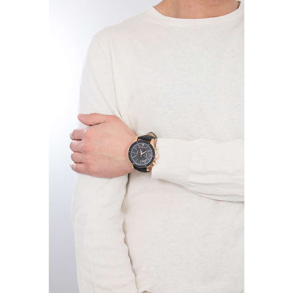 Rose gold-tone stainless steel case with a black leather strap. Fixed black stainless steel bezel. Black dial with rose gold-tone hands and index hour markers. Minute markers around the outer rim. Dial Type: Analog. Date display at the 5 o'clock position. Two - 60 second and 24 hour subdials. SII Caliber VK64 quartz movement. Scratch resistant mineral crystal. Screw down crown. Solid case back. Round case shape, case size: 44 mm, case thickness: 11.45 mm. Buckle clasp. Water resistant at 100 meters / 330 feet. Functions: date, hour, minute, second. Dress watch style. Watch label: Japan Movt. Maserati Circuito Black Dial Men's Watch R8871627001.