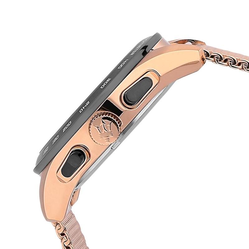 Rose gold PVD stainless steel case with a rose gold PVD stainless steel milanese mesh bracelet. Fixed rose gold PVD bezel with a black PVD ring showing tachymeter markings. White dial with luminous rose gold-tone hands and index hour markers. Arabic numerals mark the 3, 6 and 9 o'clock positions. Minute markers around the outer rim. Dial Type: Analog. Luminescent hands and markers. Chronograph - three sub-dials displaying: 60 second, 30 minute and 24 hour. Miyota caliber JS50 quartz movement. Scratch resistant mineral crystal. Screw down crown. Solid case back. Round case shape. Case size: 45 mm. Case thickness: 13 mm. Band width: 22 mm. Fold over slip through clasp. Water resistant at 100 meters / 330 feet. Functions: chronograph, tachymeter, GMT, second time zone, hour, minute, second. Casual watch style. Watch label: Japan Movt. Maserati Traguardo Chronograph Quartz White Dial Men's Watch R8873612011.