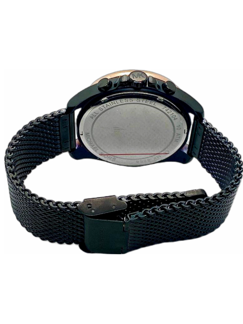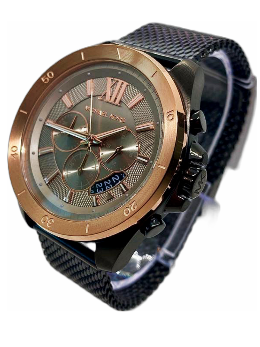 Grey-plated stainless steel case with a grey-plated stainless steel mesh bracelet. Fixed rose gold-tone bezel. Grey dial with luminous rose gold-tone hands and index hour markers. A Roman numeral appears at the 12 o'clock position. Minute markers around the outer rim. Dial Type: Analog. Luminescent hands and markers. Date display between the 4 and 5 o'clock positions. Chronograph - three sub-dials displaying: 60 second, 30 minute and 24 hours. Quartz movement. Scratch resistant mineral crystal. Solid case back. Round case shape. Case size: 45 mm. Case thickness: 11 mm. Band width: 22 mm. Fold over slip through clasp. Water resistant at 50 meters / 165 feet. Functions: chronograph, date, hour, minute, second. Brecken Series. Casual watch style. Michael Kors Brecken Chronograph Quartz Grey Dial Men's Watch MK8868.