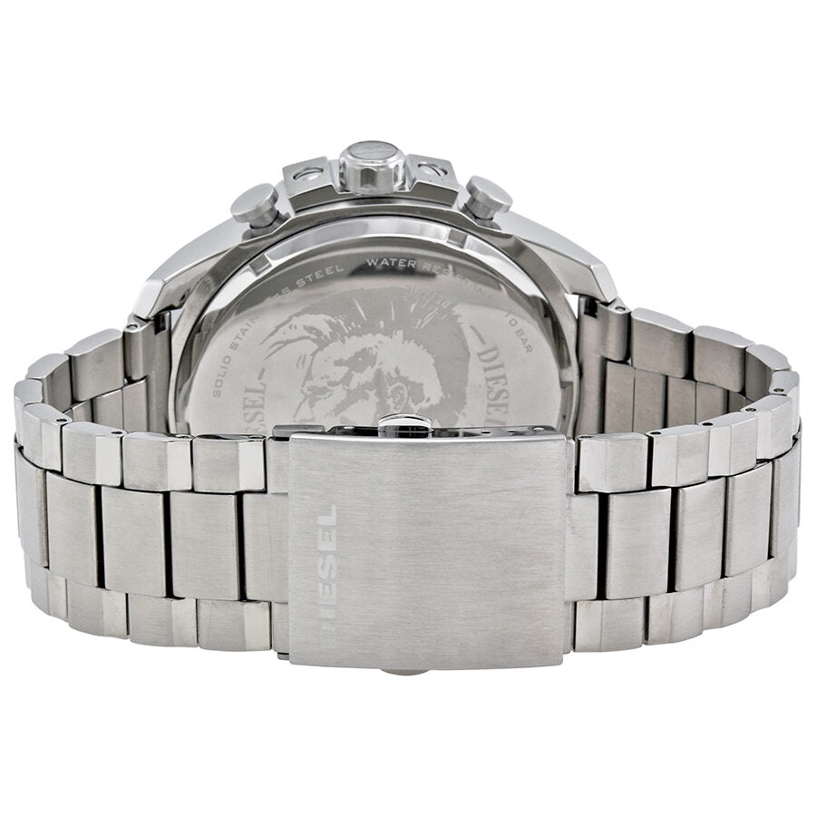 Stainless steel case with a stainless steel bracelet. Fixed stainless steel bezel. Black dial with luminous hands and index hour markers. An Arabic numeral marks the 12 o'clock position. Minute markers around the outer rim. Dial Type: Analog. Luminescent hands and markers. Date display at the 3 o'clock position. Chronograph - three sub-dials displaying: 60 second, 60 minute and 1/10th of a second. Quartz movement. Scratch resistant mineral crystal. Solid case back. Case dimensions: 59 mm x 51 mm. Case thickness: 14 mm. Round case shape. Band width: 25 mm. Band length: 8 inches. Deployment clasp. Water resistant at 100 meters / 330 feet. Functions: chronograph, date, hour, minute, second. Casual watch style. Diesel Chief Chronograph Black Dial Stainless Steel Men's Watch DZ4308.