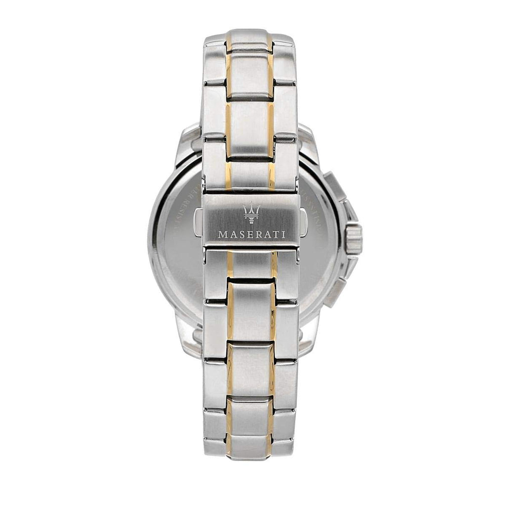 Stainless steel case with a stainless steel bracelet with gold PVD accents. Fixed stainless steel bezel. Blue dial with luminous gold-tone hands and index hour markers. Minute markers around the outer rim. Dial Type: Analog. Luminescent hands and markers. Date display between the 4 and 5 o'clock positions. Chronograph - three sub-dials displaying: 60 second, 60 minute and 24 hour. Hattori caliber VD53 quartz movement. Scratch resistant mineral crystal. Pull / push crown. Solid case back. Round case shape. Case size: 44 mm. Case thickness: 11 mm. Band width: 20 mm. Fold over clasp with a push button release. Water resistant at 50 meters / 165 feet. Functions: chronograph, date, hour, minute, second. Successo Series. Sport watch style. Watch label: Japan Movt. Maserati Successo Chronograph Quartz Blue Dial Men's Watch R8873621016.